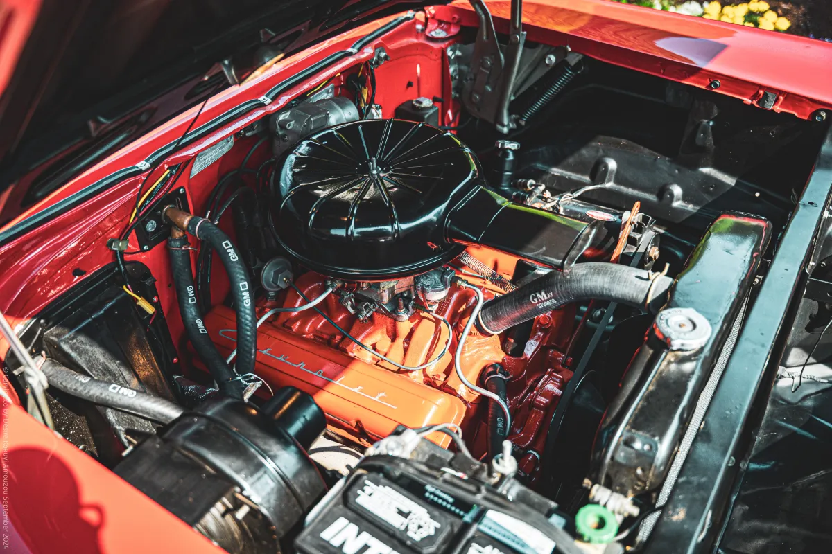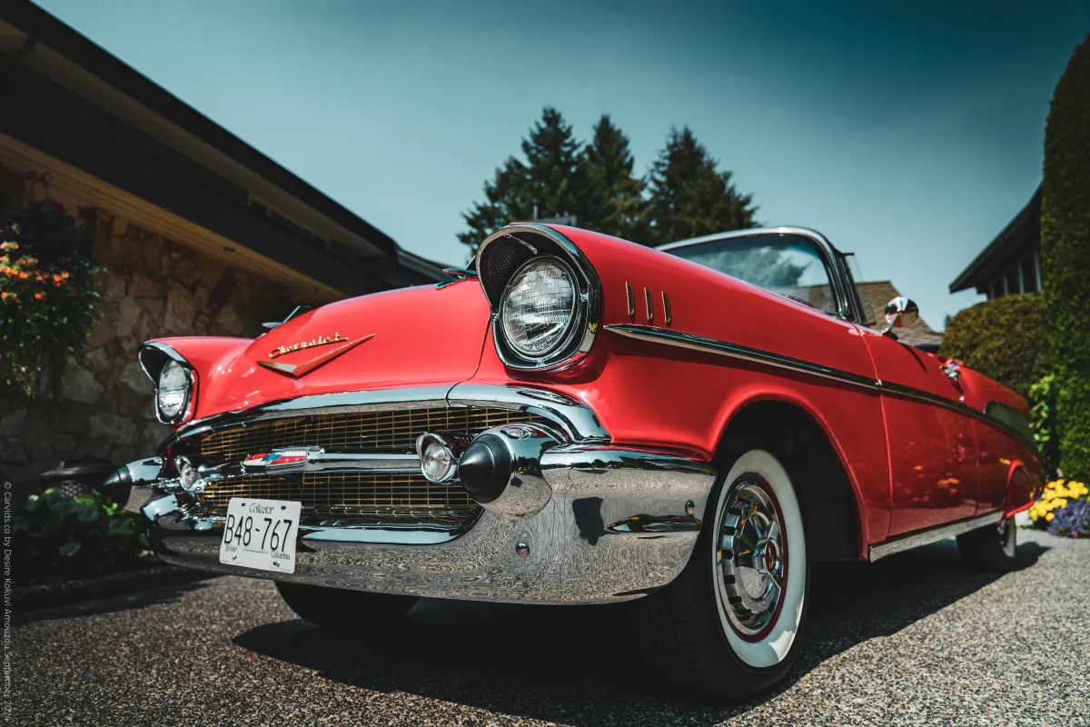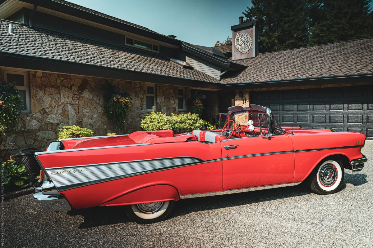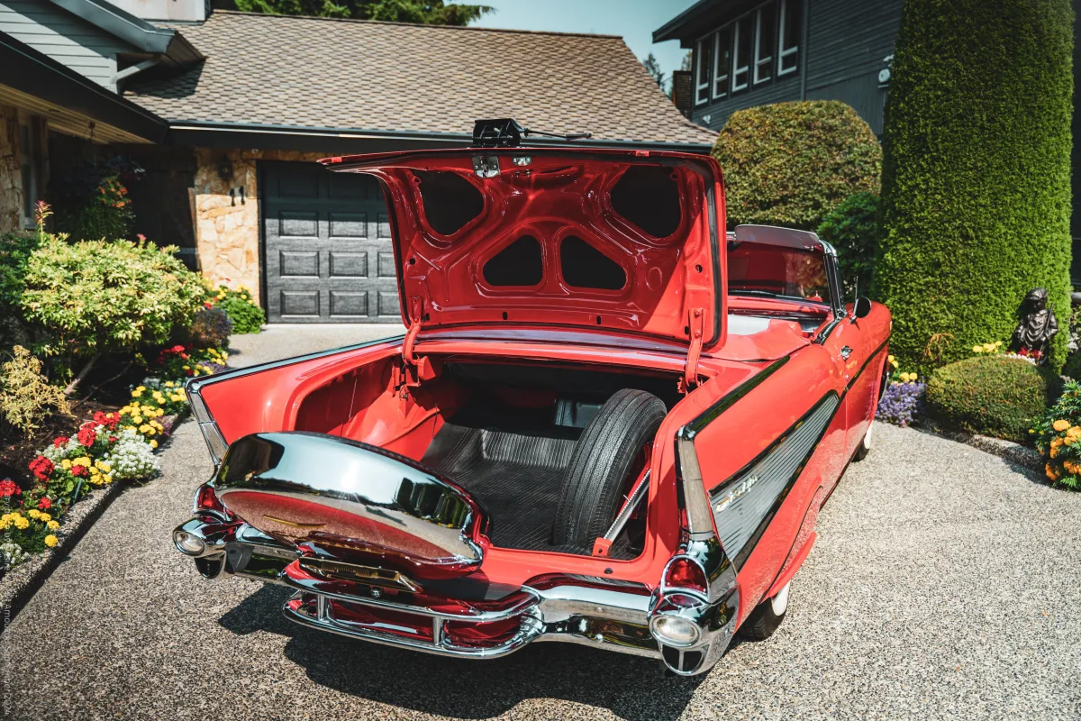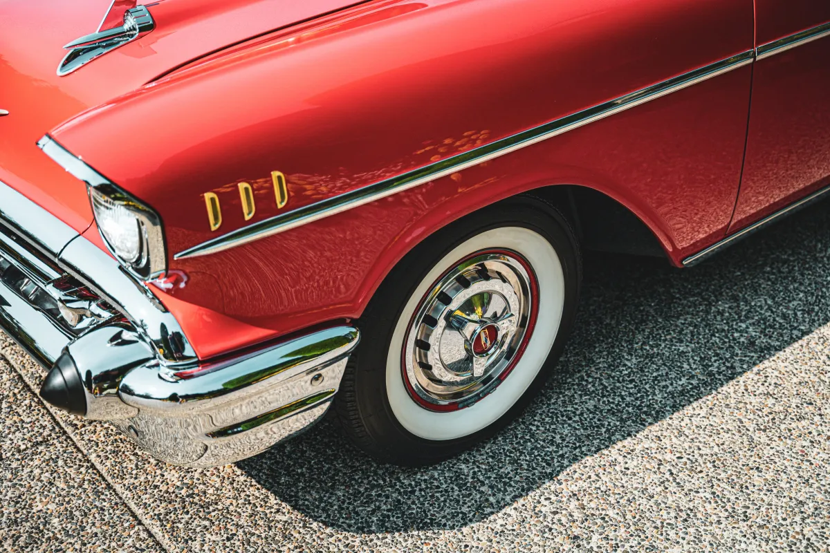 Step back in time with this fully restored, Matador Red 1957 Chevrolet Bel Air Convertible! A true American classic, this 2-door beauty features the iconic Continental kit and rear wheel well covers, making it a standout wherever it goes. With its bold fins, chrome accents, and elegant styling, this Bel Air has been meticulously restored to its original glory.
